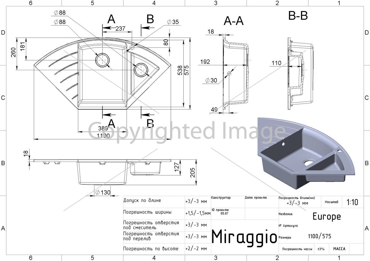 Заводской стандарт модели EUROPE предусматривает отверстия под смеситель и перелив. В комплекте поставляется сифон и крепежи для дополнительной фиксации мойки со столешницей.