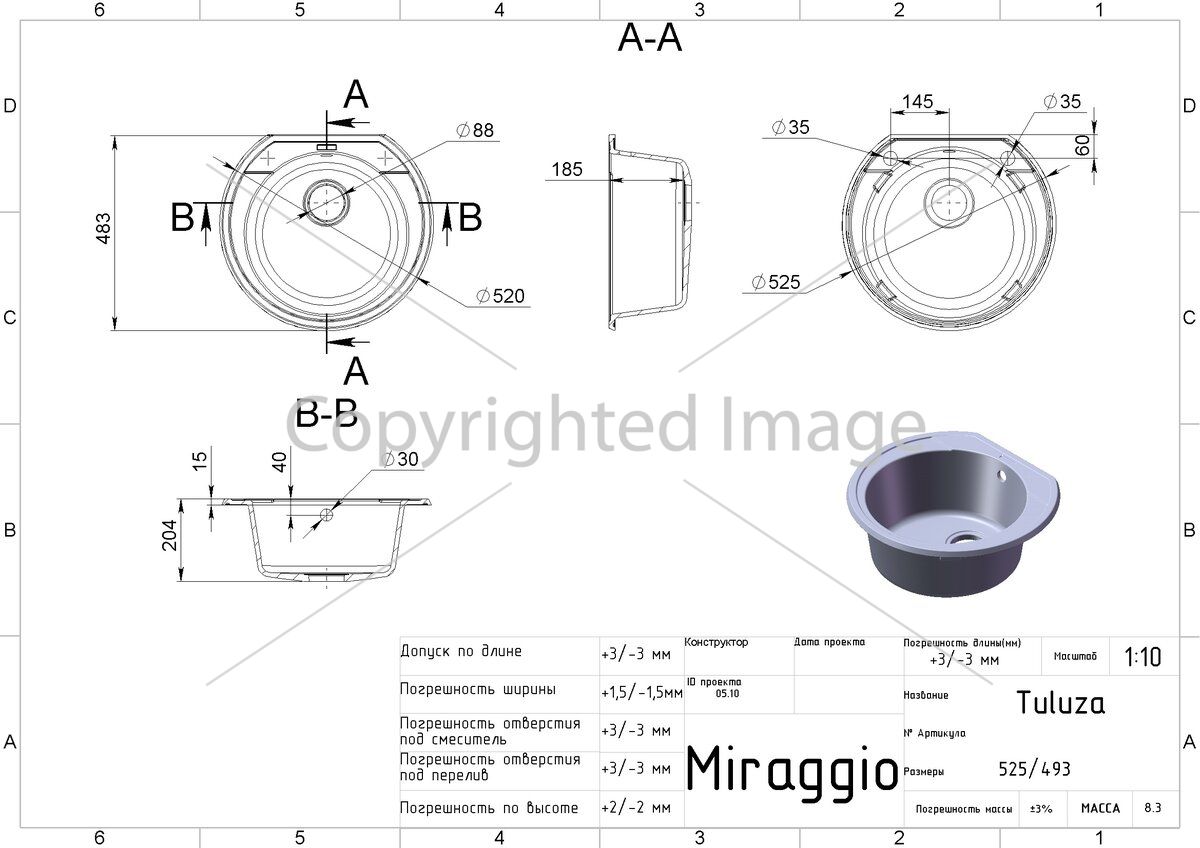 Заводской стандарт модели TULUZA предусматривает надсверливания под отверстия для смесителя в 2-х точках и перелив. В комплекте поставляется сифон и крепежи для дополнительной фиксации мойки со столешницей.