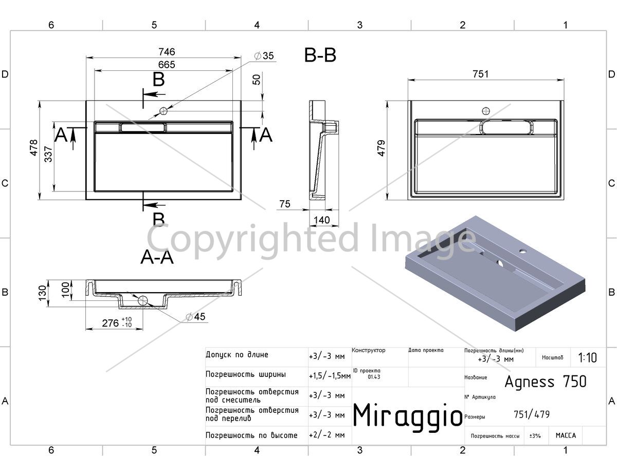 Сантехника MIRAGGIO производится по авторской технологии смешивания мраморной крошки и полиэфирной смолы в вакууме. Материал умывальника - MIRAMARBLE MATT. В ее структуре отсутствуют микропоры, что исключает развитие бактерий в толще стенок. Дополнительно изделие покрыто антибактериальным гелем. Продукция полируется пастой с матовым финишем. Поверхность умывальника матовая.