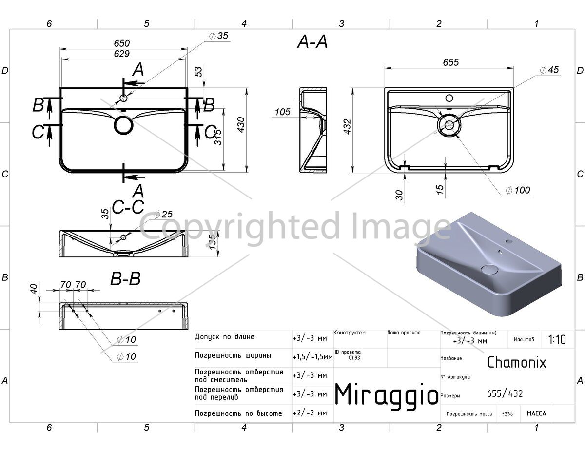 Сантехніка MIRAGGIO виробляється за авторською технологією змішування кварцового піску і поліефірної смоли в вакуумі. Матеріал умивальника - MIRASTONE. Вироби мають однорідну текстуру та колір по всій товщі стін. У його структурі відсутні мікропори, що виключає розвиток бактерій у товщі стінок. Поверхня умивальника матова.
