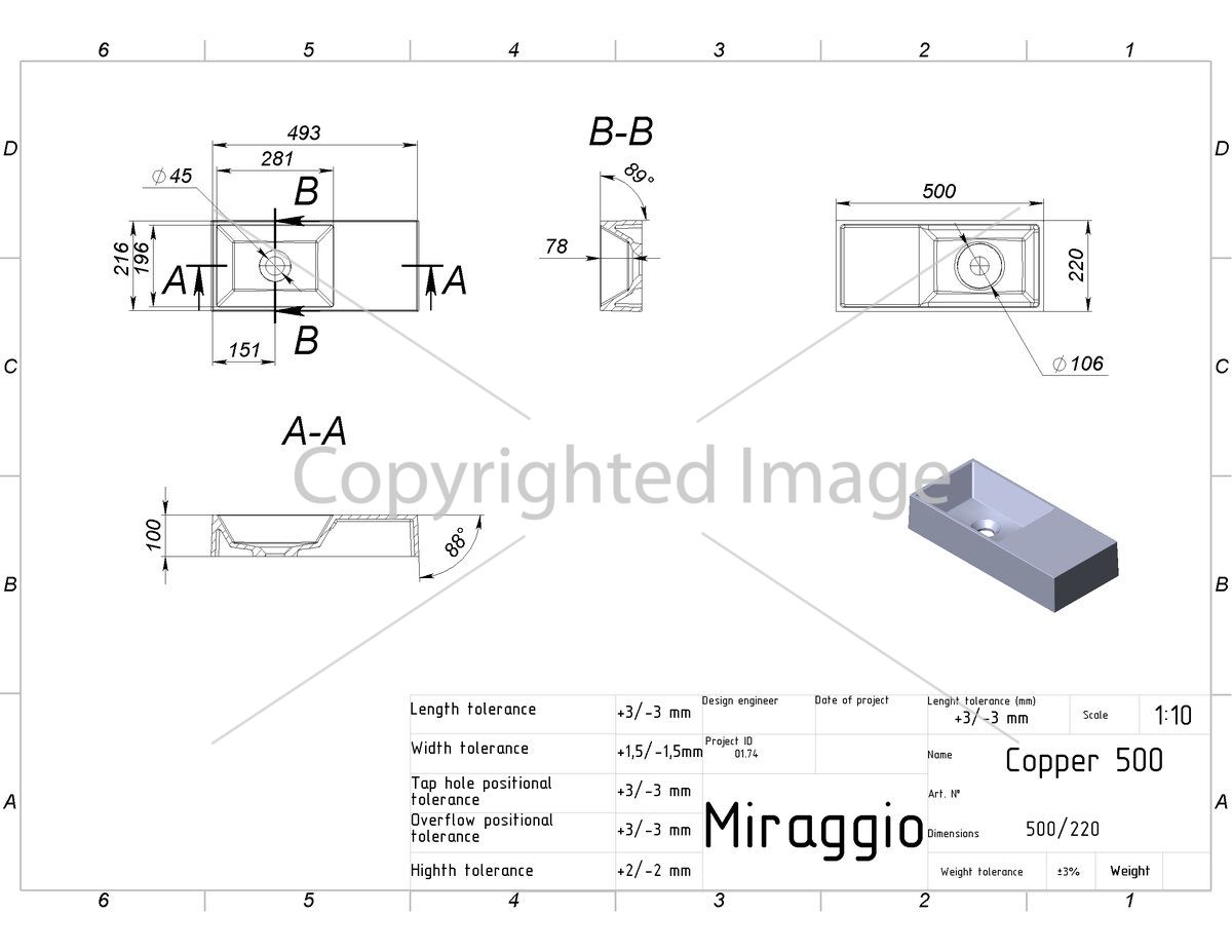 Прямокутний умивальник COPPER 500 MIRASOFT з глибокою трапецієподібною чашею та крилом для засобів гігієни - зручний та витончений аксесуар ванної кімнати. Раковина передбачає окремий або настінний змішувач. Має накладний спосіб монтажу та легко встановлюється на тумбу або полицю.