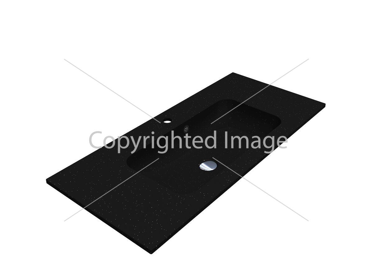 Матовий чорний умивальник з кварцового піску на тумбу DELLA 1000 з прямокутною чашею – втілення класики. Широкі крила з обох боків чаші дозволяють розташувати банне приладдя. Раковина має отвори під змішувач та перелив. Умивальник може бути встановлений накладним методом на тумбу або врізаний у полицю.