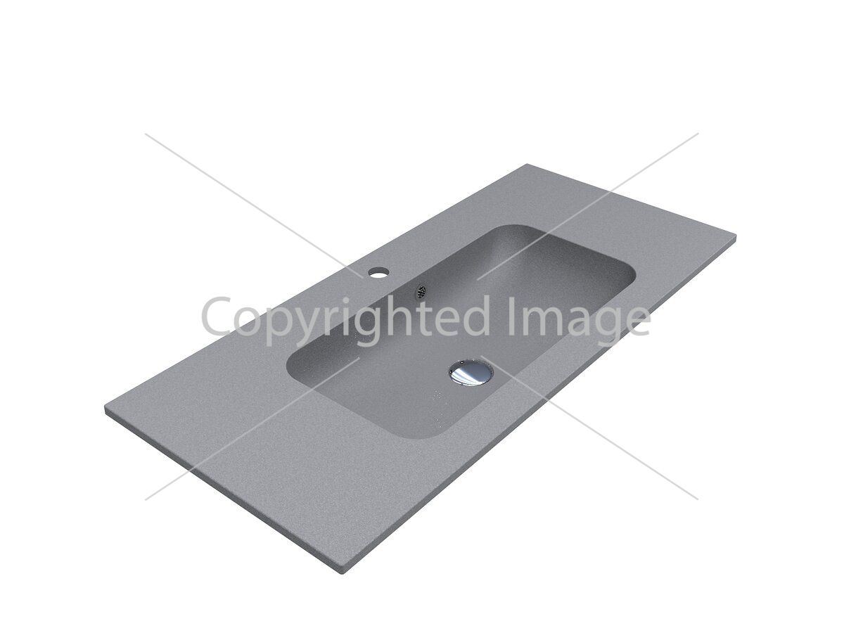 Матовий сірий умивальник з кварцового піску на тумбу DELLA 1000 з прямокутною чашею – втілення класики. Широкі крила з обох боків чаші дозволяють розташувати банне приладдя. Раковина має отвори під змішувач та перелив. Умивальник може бути встановлений накладним методом на тумбу або врізаний у полицю.