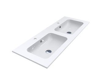 Подвійний умивальник з литого мармуру на тумбу DELLA 1200-2 з прямокутними чашами - чудове рішення для великої родини. Широкі крила дозволяють комфортно розташувати банне приладдя та проводити гігієнічні процедури вдвох. Раковина має два отвори під змішувач та переливи у кожній чаші. Умивальник може бути встановлений накладним методом на тумбу або врізаний в полицю.