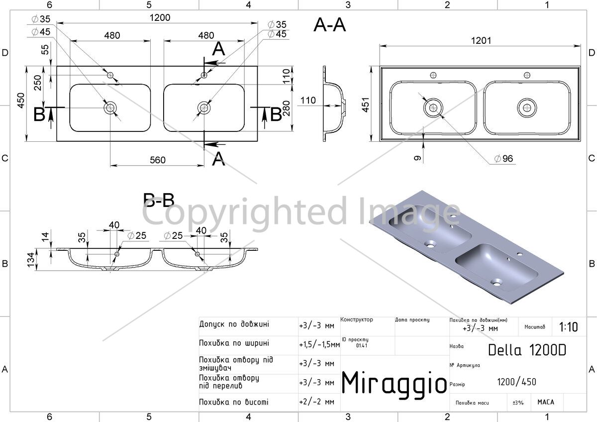 Заводской стандарт модели DELLA 1200-2 предусматривает отверстия под два смесителя и перелив. Опционально можно заказать умывальник с одним из них или совсем без отверстий. В комплекте поставляется 2 сифона. Дополнительно донный клапан клик-клак можно заказать на сайте.