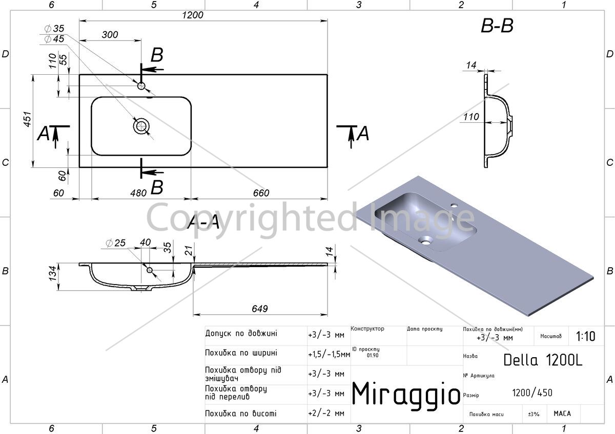 Матовий умивальник з крилом DELLA 1200 L - оригінальне та комфортне рішення для ванної кімнати! Прямокутна чаша зміщена вліво, що дозволяє розташувати під крилом пральну машину чи тумбу. Раковина має отвір під змішувач та перелив. Умивальник може бути встановлений накладним методом на тумбу або врізаний у полицю.