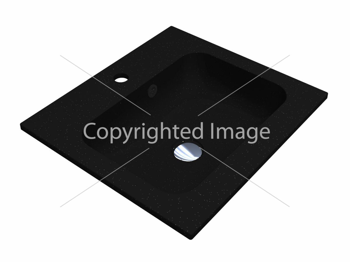 Компактний чорний умивальник із кварцового піску DELLA 500 з майже квадратною чашею - оптимальне рішення для маленької ванної кімнати. Має отвори під змішувач та перелив. Раковина може бути накладена на тумбу, що також передбачає врізний спосіб монтажу.