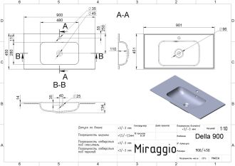 Сантехніка MIRAGGIO виробляється за авторською технологією змішування кварцового піску і поліефірної смоли в вакуумі. Матеріал умивальника - MIRASTONE. Вироби мають однорідну текстуру та колір по всій товщі стін. У його структурі відсутні мікропори, що виключає розвиток бактерій у товщі стінок. Поверхня умивальника матова.