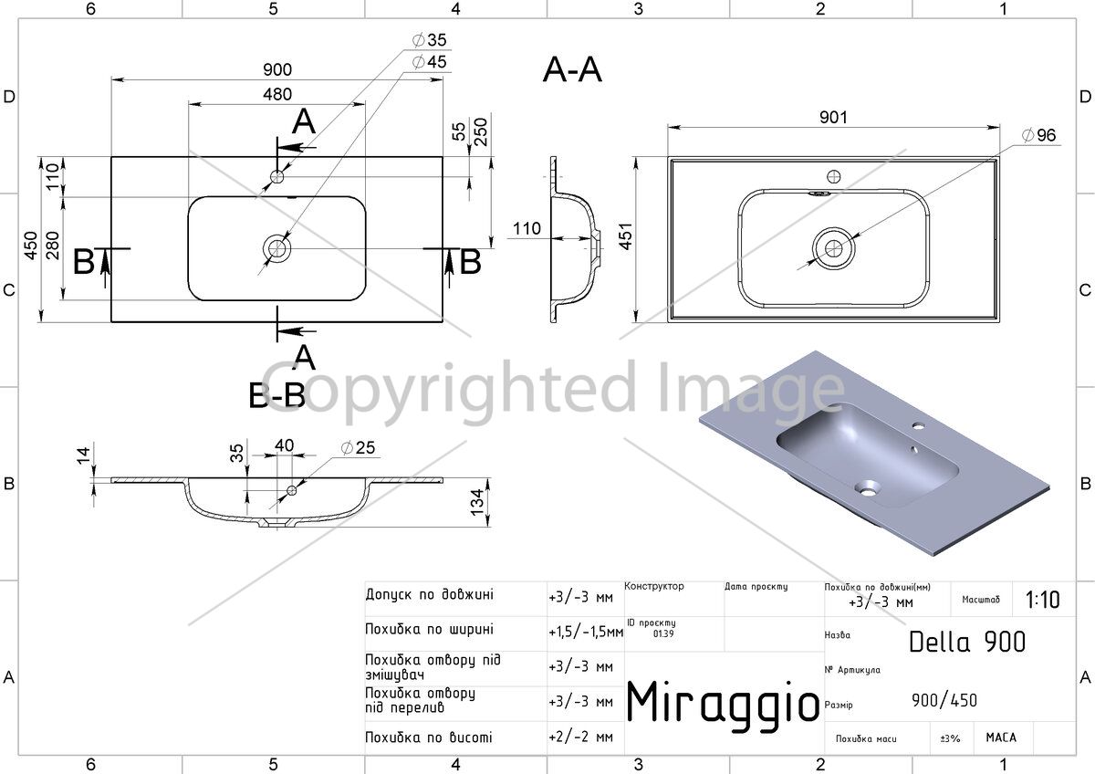 Заводской стандарт модели DELLA 900 предусматривает отверстия под смеситель и перелив. Опционально можно заказать умывальник с одним из них или совсем без отверстий. Дополнительно донный клапан клик-клак можно заказать на сайте.