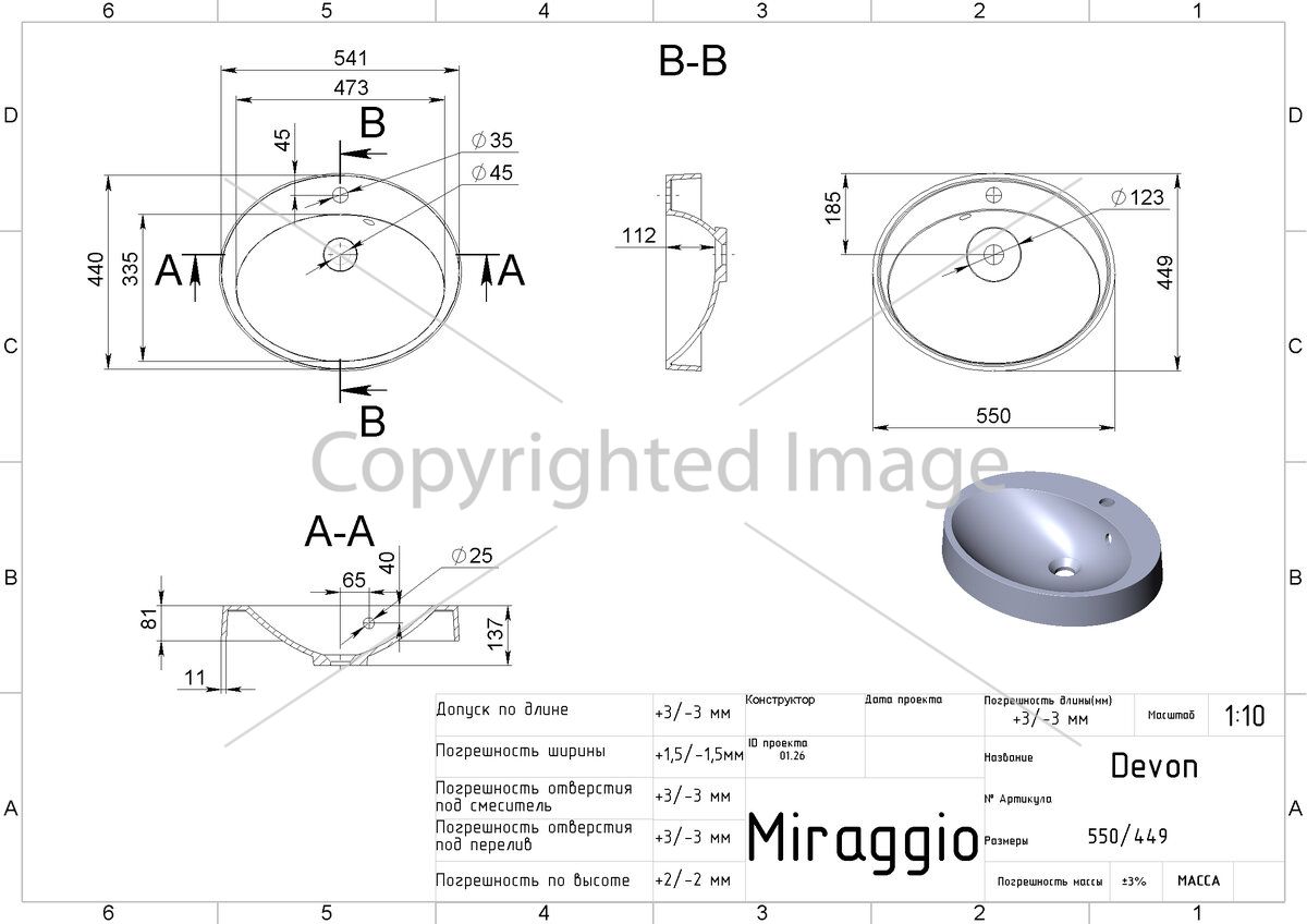 Сантехніка MIRAGGIO виробляється за авторською технологією змішування кварцового піску і поліефірної смоли в вакуумі. Матеріал умивальника - MIRASTONE. Вироби мають однорідну текстуру та колір по всій товщі стін. У його структурі відсутні мікропори, що виключає розвиток бактерій у товщі стінок. Поверхня умивальника матова.