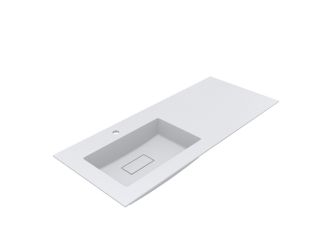 Меблевий матовий умивальник з литого мармуру ERICA 1200 L з чашею ліворуч - сучасний вибір для стильної ванної кімнати. Неординарна чаша з прямими кутами привертає увагу. Широке крило праворуч дозволяє організувати простір для косметики та аксесуарів. Поєднання чаші з крилом-стільницею створює відчуття монолітності та робить зручним догляд за меблями у зоні водних процедур. Раковина має накладний та врізний спосіб монтажу, легко встановлюється на прямокутну тумбу або може бути інстальована у стільницю. Отвір під злив прихований декоративною накладкою.