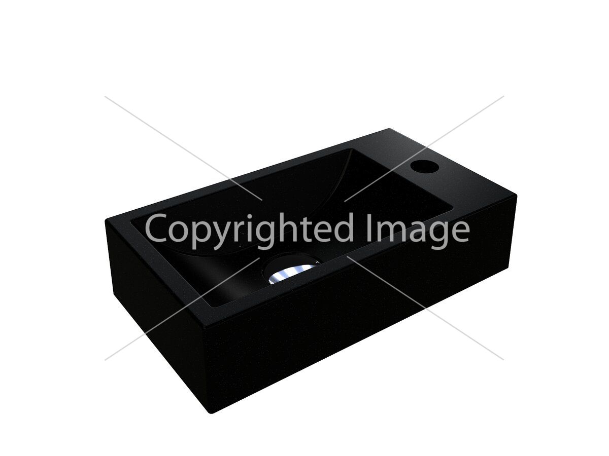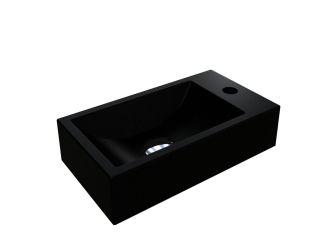 Черный прямоугольный умывальник из кварцевого песка FARO L - функциональный аксессуар для небольшой ванной комнаты в классическом, современном или стиле минимализм. Оптимальное решение для организации пространства благодаря возможности установить смеситель на крыле справа. Умывальник имеет подвесной тип монтажа.