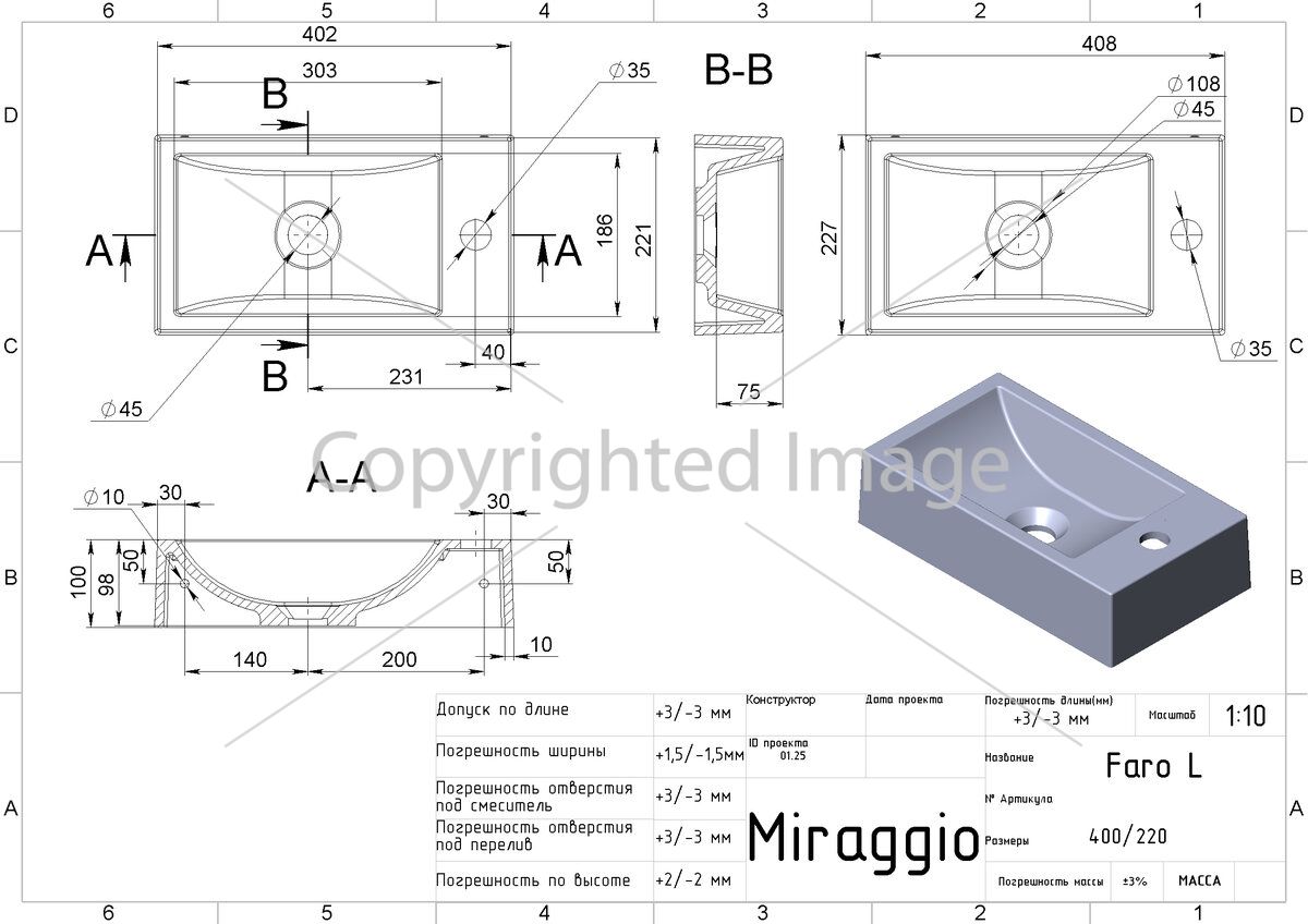 Сантехніка MIRAGGIO виробляється за авторською технологією змішування кварцового піску і поліефірної смоли в вакуумі. Матеріал умивальника - MIRASTONE. Вироби мають однорідну текстуру та колір по всій товщі стін. У його структурі відсутні мікропори, що виключає розвиток бактерій у товщі стінок. Поверхня умивальника матова.