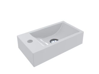 Умивальник із литого мармуру FARO R прямокутної форми - функціональний аксесуар для невеликої ванної кімнати в класичному, сучасному або стилі мінімалізм. Оптимальне рішення для організації простору завдяки можливості встановити змішувач на крилі ліворуч від чаші. Умивальник має підвісний тип монтажу.
