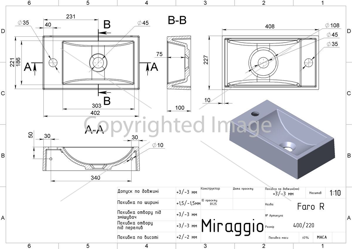 Сантехніка MIRAGGIO виробляється за авторською технологією змішування кварцового піску і поліефірної смоли в вакуумі. Матеріал умивальника - MIRASTONE. Вироби мають однорідну текстуру та колір по всій товщі стін. У його структурі відсутні мікропори, що виключає розвиток бактерій у товщі стінок. Поверхня умивальника матова.