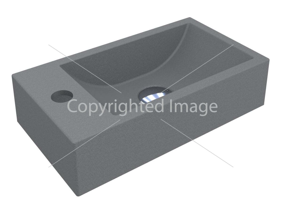 Серый прямоугольный умывальник из кварцевого песка FARO R - функциональный аксессуар для небольшой ванной комнаты в классическом, современном или стиле минимализм. Оптимальное решение для организации пространства благодаря возможности установить смеситель на крыле слева. Умывальник имеет подвесной тип монтажа.