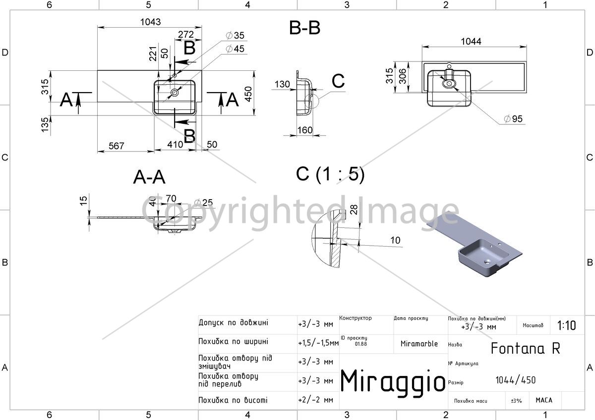 Сантехника MIRAGGIO производится по авторской технологии смешивания мраморной крошки и полиэфирной смолы в вакууме. Материал умывальника - MIRAMARBLE MATT. В ее структуре отсутствуют микропоры, что исключает развитие бактерий в толще стенок. Дополнительно изделие покрыто антибактериальным гелем. Продукция полируется пастой с матовым финишем. Поверхность умывальника матовая.