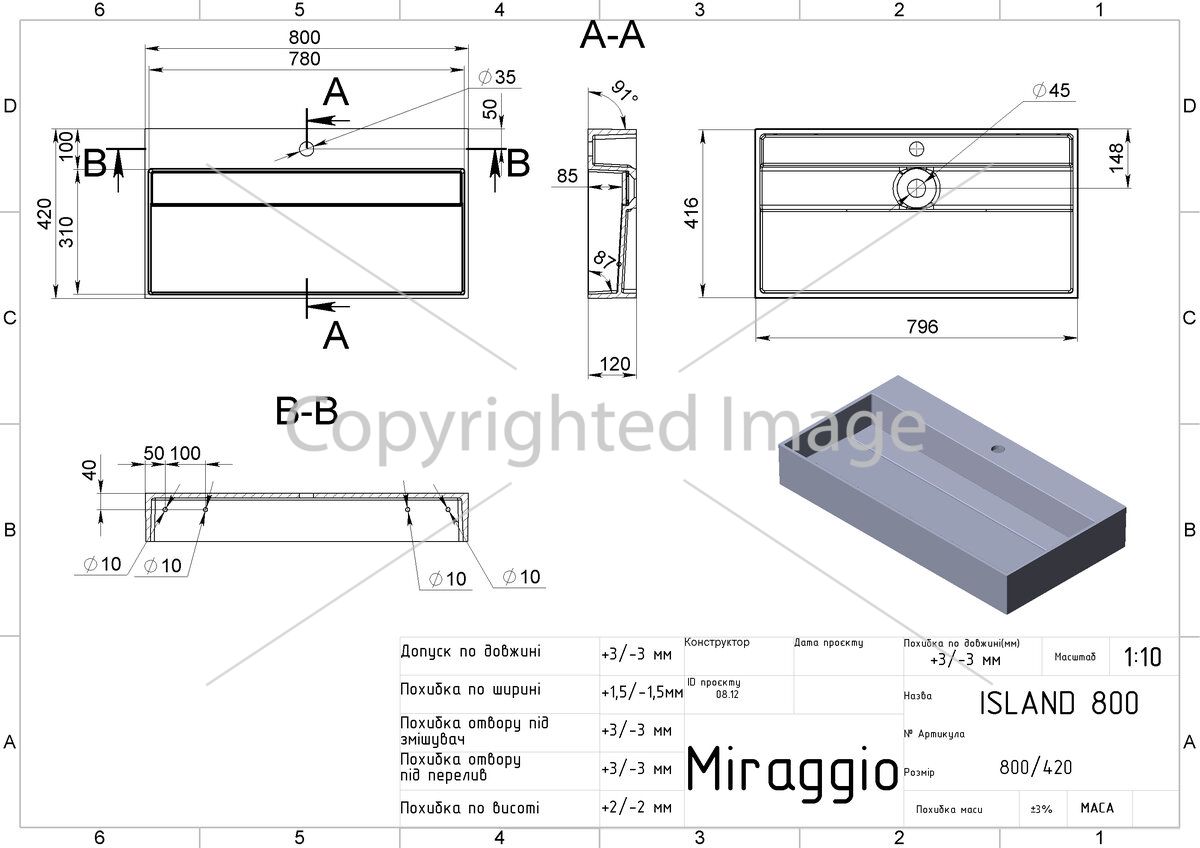 Прямокутна раковина з литого мармуру ISLAND 800 – подовжений варіант для великої ванної кімнати. Традиційна висота бортів, прямі кути, чіткі лінії та поличка для косметичних засобів біля змішувача - це оптимальне поєднання рис класичного умивальника. Передбачає накладний або врізний тип монтажу. Отвір під злив прихований декоративною накладкою.