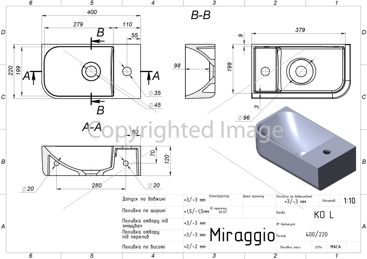 Сантехніка MIRAGGIO виробляється за авторською технологією змішування бокситу* і поліефірної смоли у вакуумі. Матеріал умивальника - MIRASOFT. Виріб має однорідну структуру на всю товщину стінок, без додаткового покриття. У матеріалі умивальника відсутні мікропори, що виключає розвиток бактерій всередині і на поверхні стінок. Поверхня умивальника - матова.