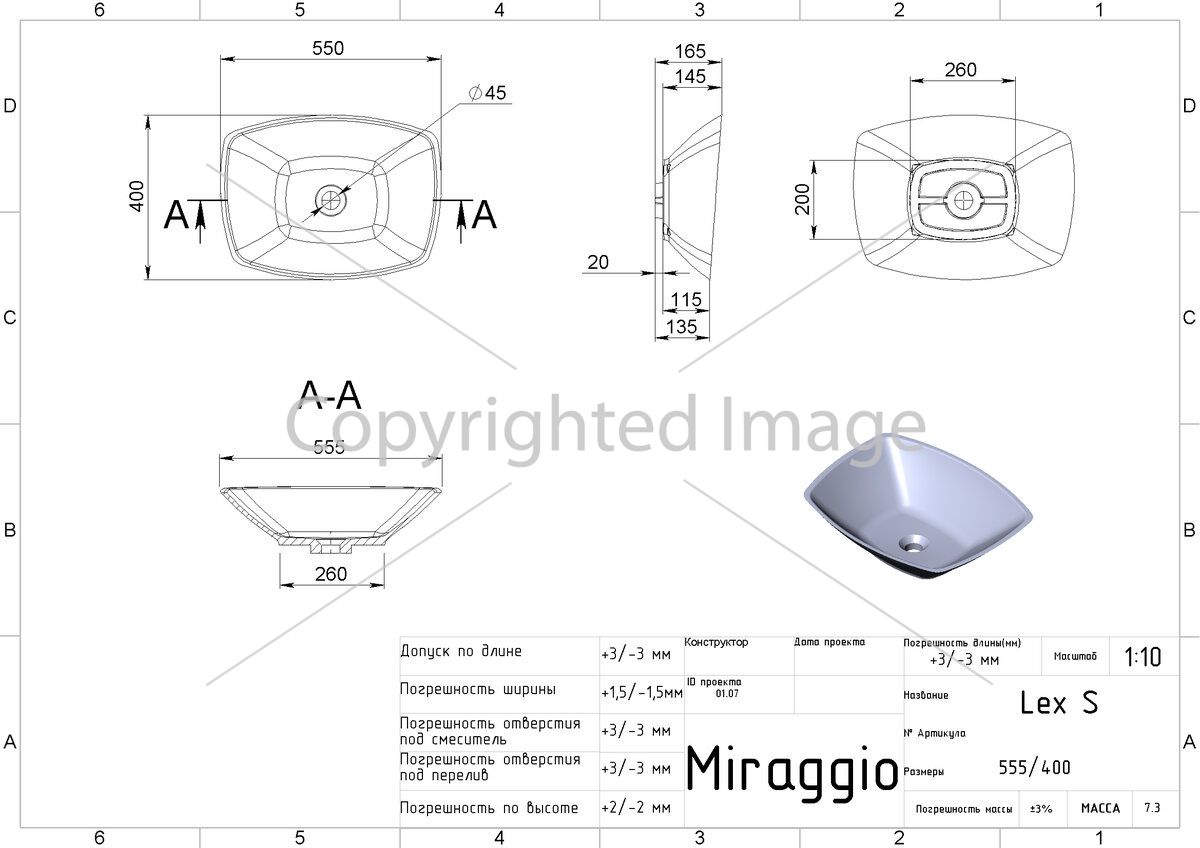 Сантехника MIRAGGIO производится по авторской технологии смешивания мраморной крошки и полиэфирной смолы в вакууме. Материал умывальника - MIRAMARBLE MATT. В ее структуре отсутствуют микропоры, что исключает развитие бактерий в толще стенок. Дополнительно изделие покрыто антибактериальным гелем. Продукция полируется пастой с матовым финишем. Поверхность умывальника матовая.