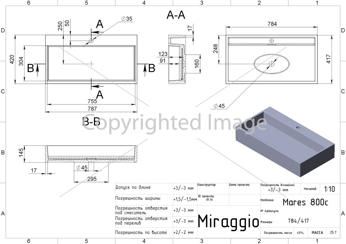 Сантехника MIRAGGIO производится по авторской технологии смешивания мраморной крошки и полиэфирной смолы в вакууме. Материал умывальника - MIRAMARBLE. В его структуре отсутствуют микропоры, что исключает развитие бактерий в толще стенок. Дополнительно изделие покрыто антибактериальным гелем. Поверхность умывальника глянцевая.
