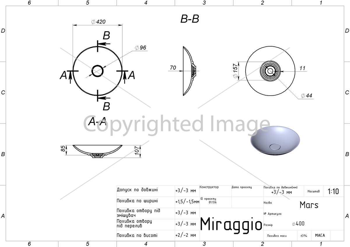 Сантехніка MIRAGGIO виробляється за авторською технологією змішування мармурової крихти та поліефірної смоли у вакуумі. Матеріал умивальника - MIRAMARBLE MATT. В її структурі відсутні мікропори, що виключає розвиток бактерій у товщі стінок. Додатково виріб покритий антибактеріальним гелем. Продукція полірується пастою з матовим фінішем. Поверхня умивальника матова.