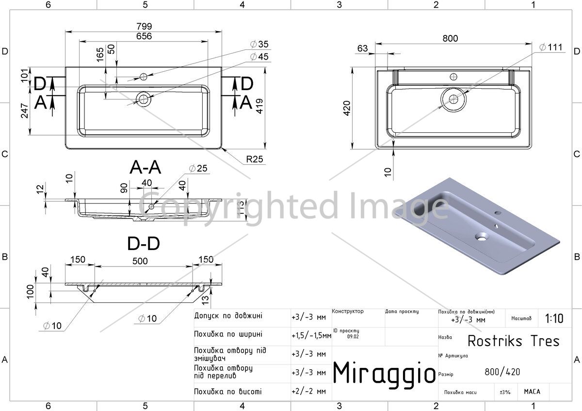 Заводський стандарт моделі ROSTRIKS TRES передбачає отвори під змішувач та перелив. Опціонально можна замовити умивальник з одним із них або зовсім без отворів. Додатково донний клапан клік-клак можна замовити на сайті.