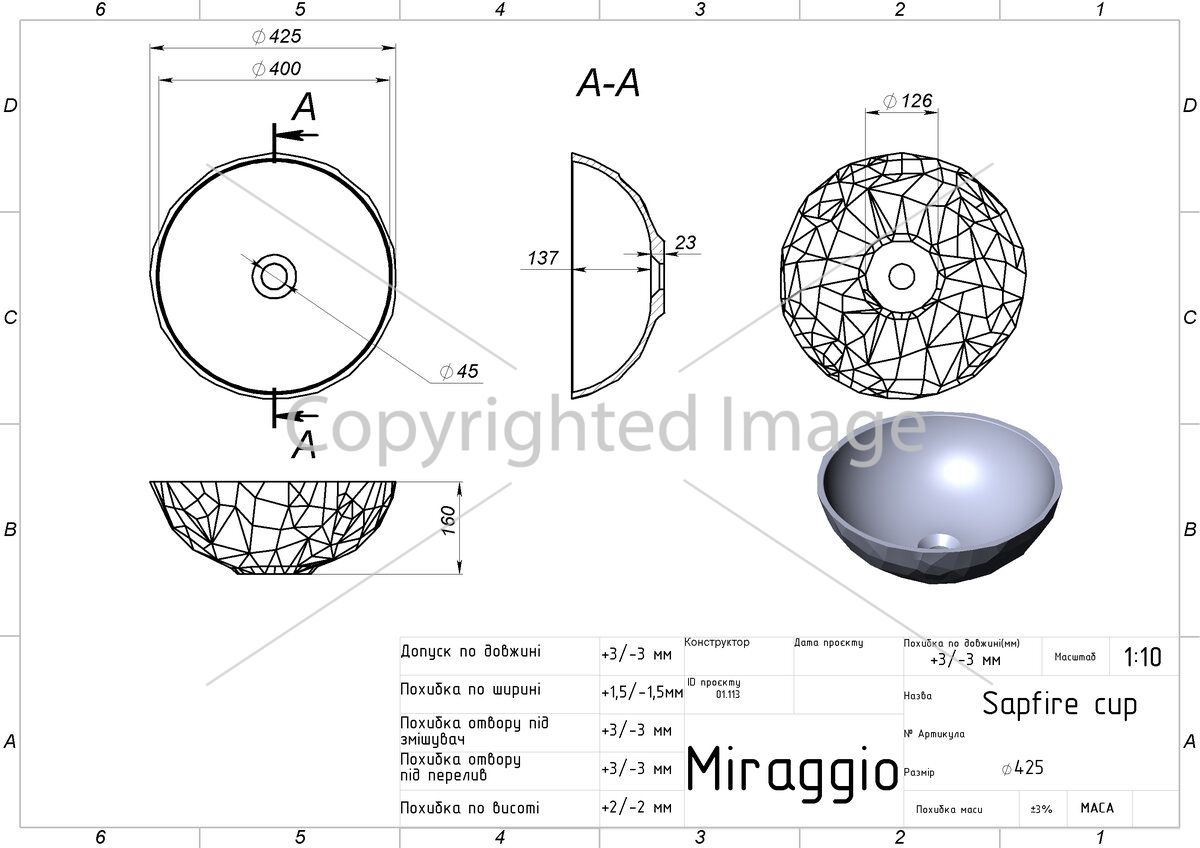 Чашеподібний матовий умивальник з литого мармуру SAPFIRE – новинка 2022 року! Оригінальна напівсфера, огранована немов дорогоцінний камінь на зовнішній стороні стане чудовою прикрасою ванної кімнати. Раковина передбачає окремий або настінний змішувач. Умивальник має накладний тип монтажу.