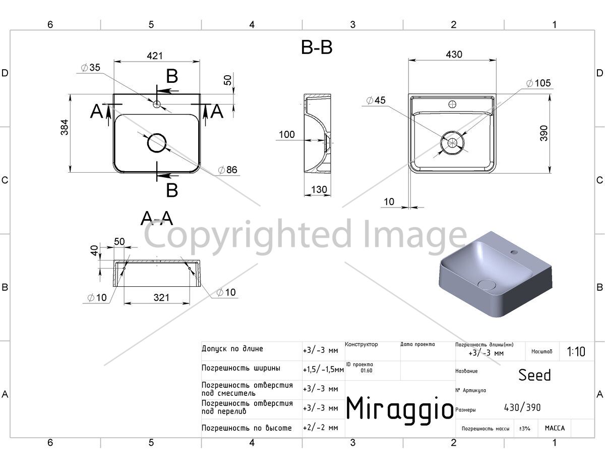 Умывальник из литого мрамора SEED - авторская разработка отдела проектирования Miraggio. Компактная классическая раковина позволит оптимально использовать пространство ванной комнаты. На заднем борту рядом со смесителем можно расположить косметические средства. Умывальник имеет подвесной тип монтажа. Отверстие под слив скрыто декоративной накладкой.