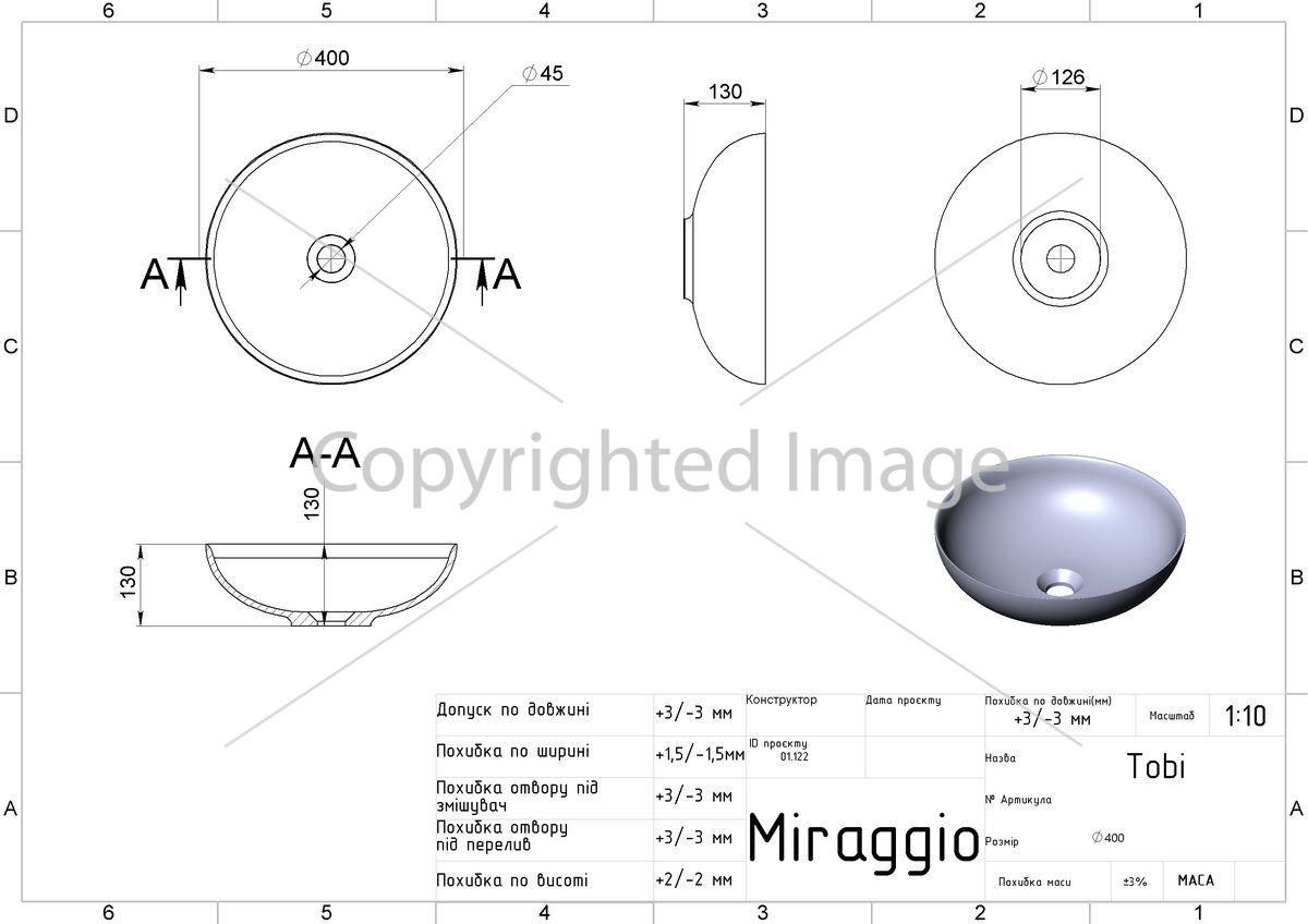 Заводской стандарт модели TOBI не предусматривает отверстия под смеситель и перелив. Опционально донный клапан клик-клак можно заказать на сайте.