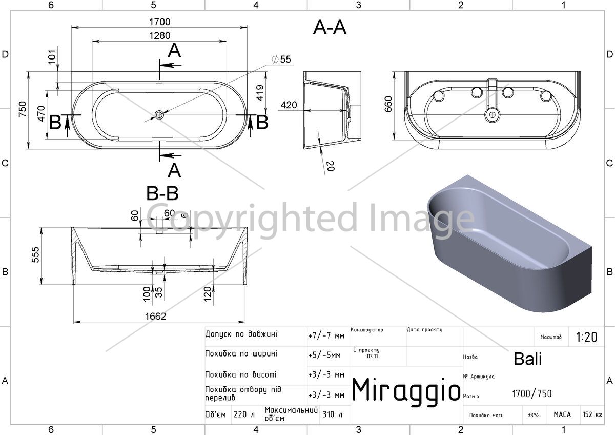 Сантехніка MIRAGGIO виробляється за авторською технологією змішування мармурової крихти та поліефірної смоли у вакуумі. Матеріал ванни - MIRAMARBLE. В її структурі відсутні мікропори, що виключає розвиток бактерій в товщі стінок. Додатково виріб покритий антибактеріальним гелем. Поверхня ванни глянцева.