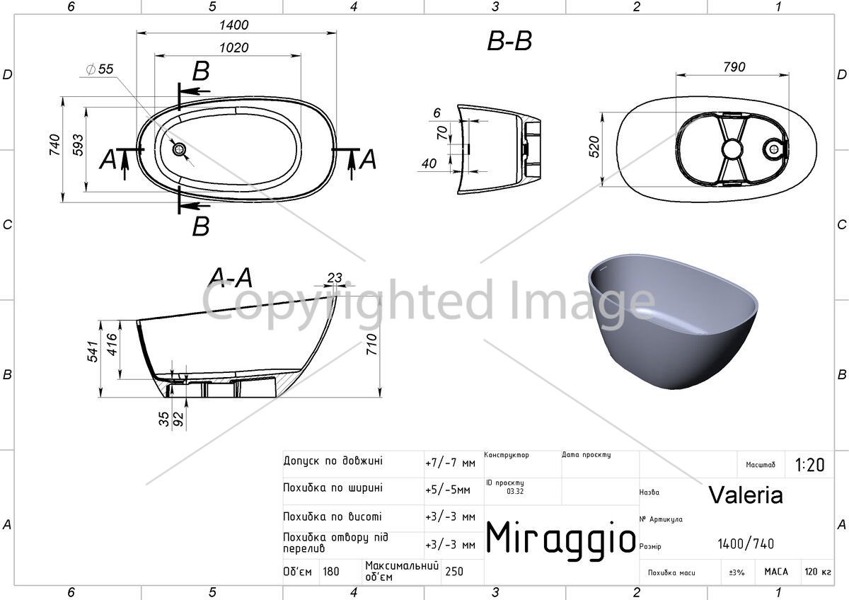 Заводський стандарт моделі VALERIA передбачає щілинний перелив. Опціонально можна зробити отвір під ревізію.